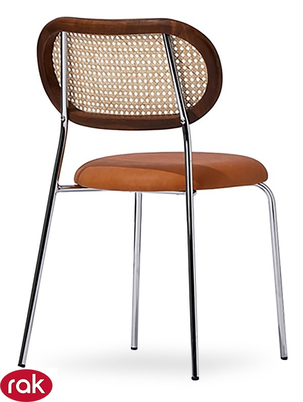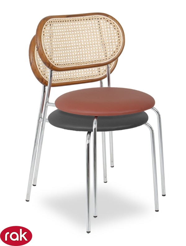 SILLA IMPORTADA APILABLE MARCA RAK, RESPALDO EN MADERA DE TEKA Y MIMBRE NATURAL, ESTRUCTURA TUBULAR CROMADA , ASIENTO TAPIZADO COLOR A ELECCION MOD. HEIDI.